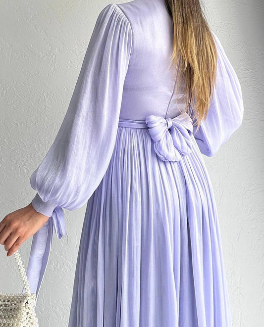 Long Sleeve Lilac Metallic Dress - Modest Evening Dress