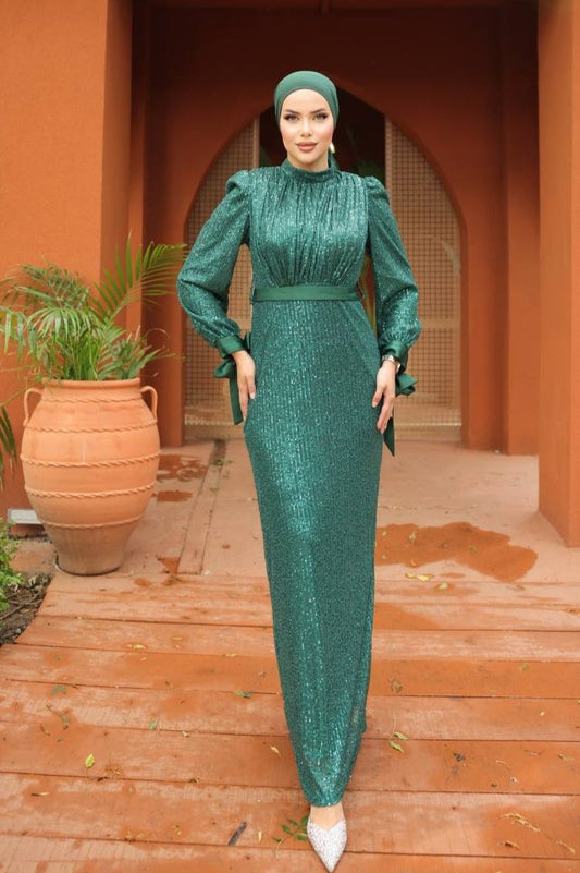 Forest Green Long Sleeve Sequin Evening Dress