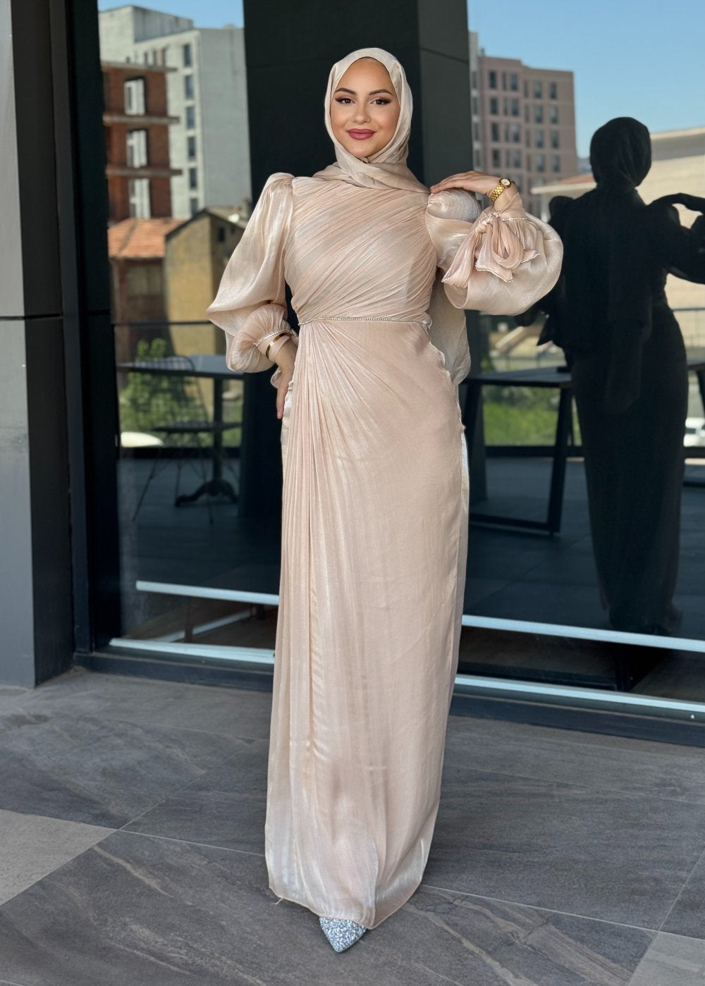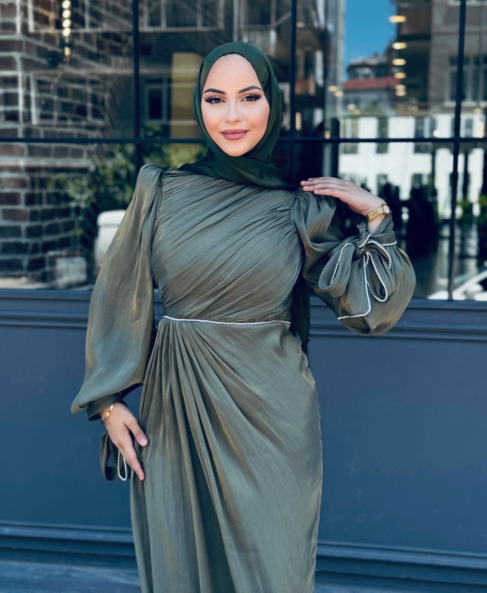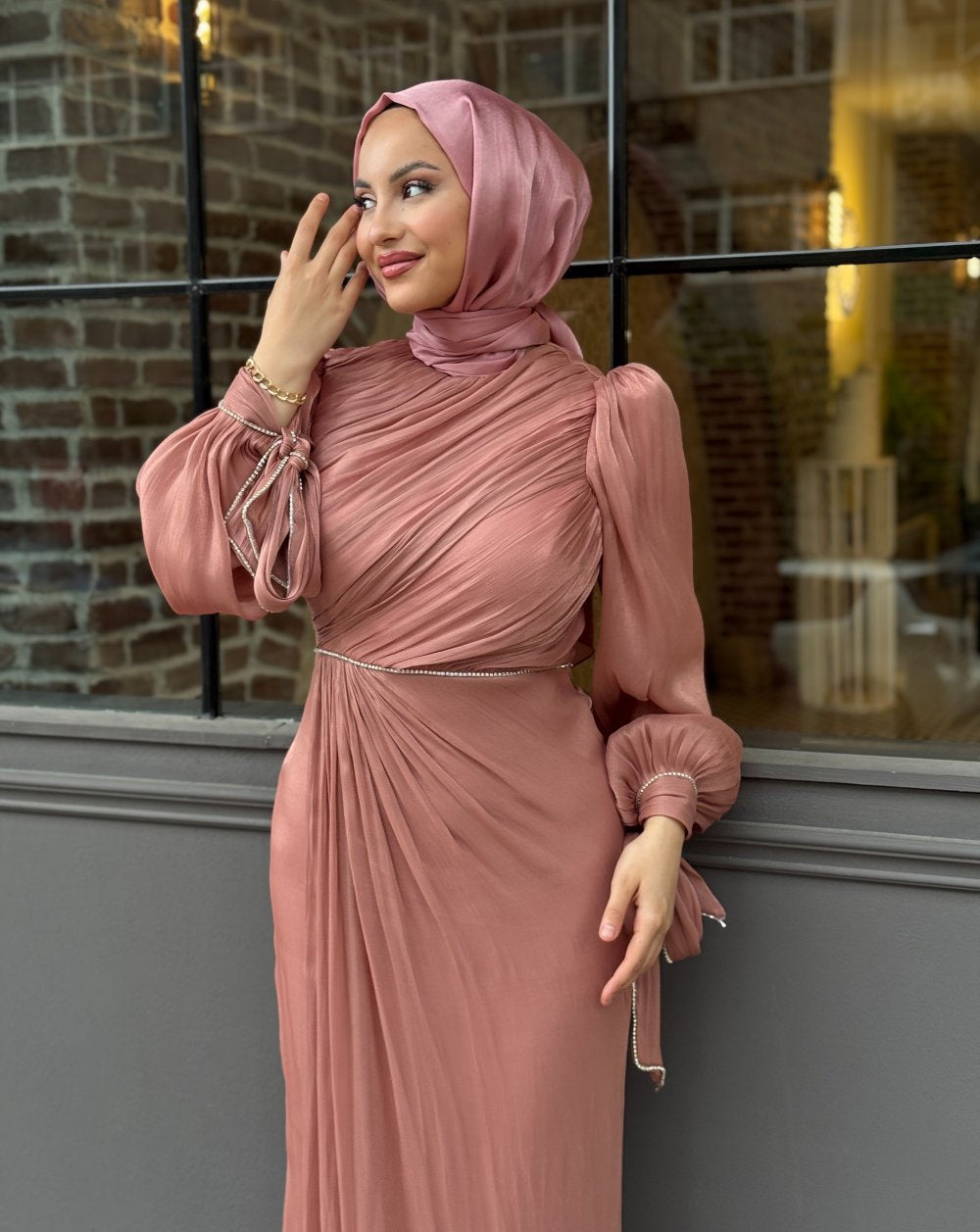 Une robe spectaculaire pour la femme voilée qui aime l'élégance, confectionnée avec un drapé soigné qui sublime chaque courbe. Le col montant et les plis froncés créent une silhouette majestueuse, tandis que les longues manches bouffantes et la taille cintrée sont ornées de délicats galons de cristal, ajoutant une touche d'éclat et de raffinement. Parfaite pour toutes les occasions spéciales : mariages, fiançailles, galas et plus encore.