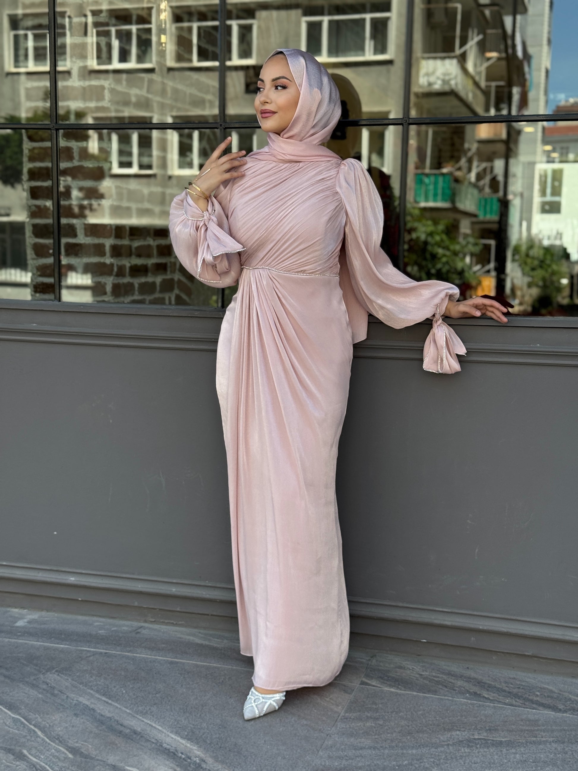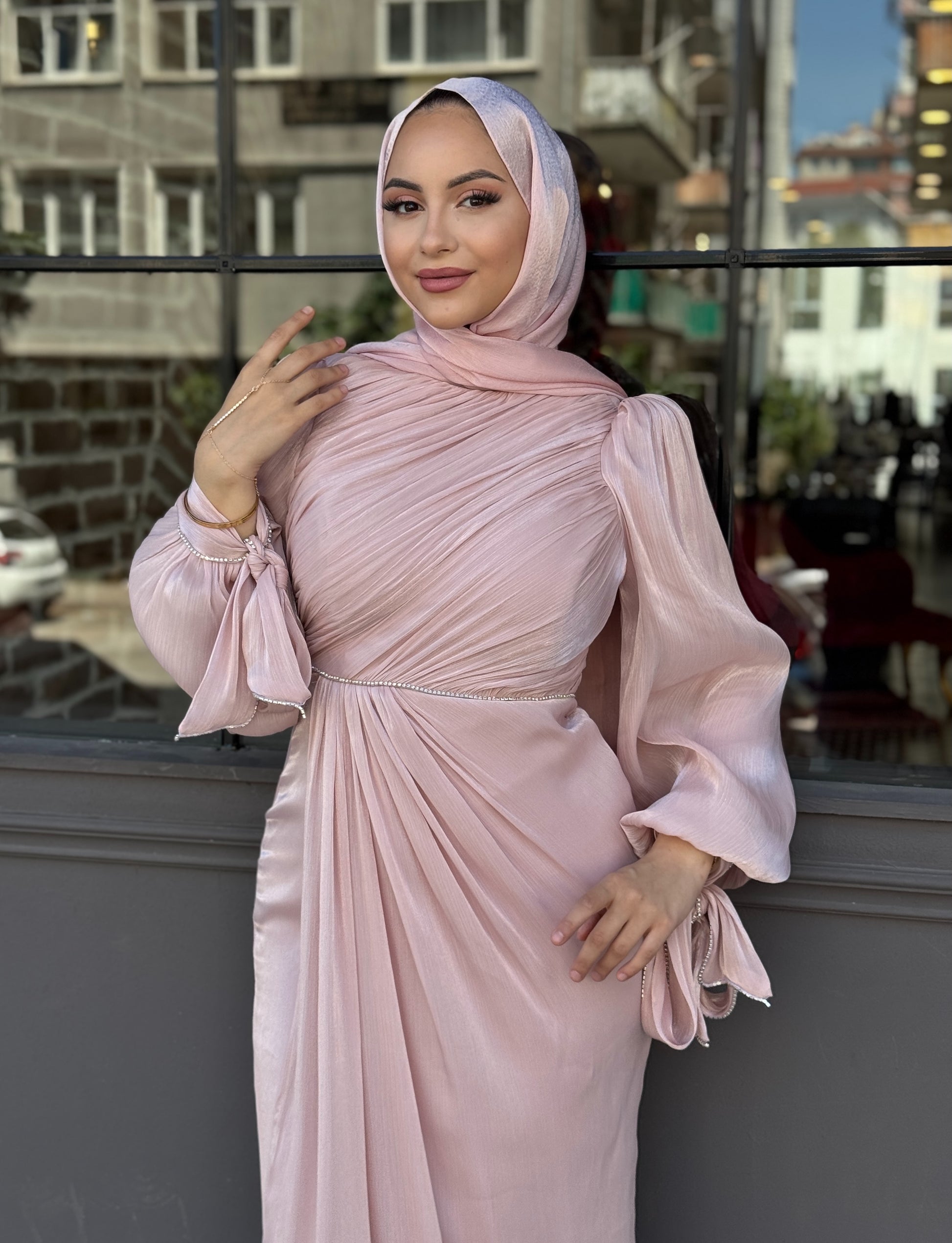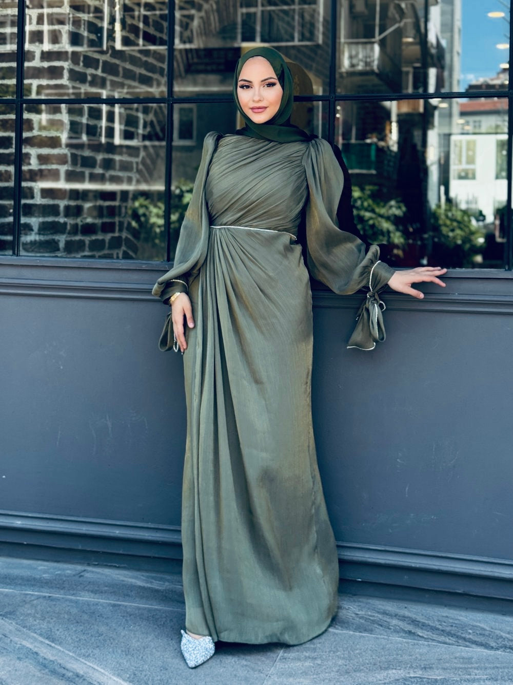 Une robe spectaculaire pour la femme voilée qui aime l'élégance, confectionnée avec un drapé soigné qui sublime chaque courbe. Le col montant et les plis froncés créent une silhouette majestueuse, tandis que les longues manches bouffantes et la taille cintrée sont ornées de délicats galons de cristal, ajoutant une touche d'éclat et de raffinement. Parfaite pour toutes les occasions spéciales : mariages, fiançailles, galas et plus encore.