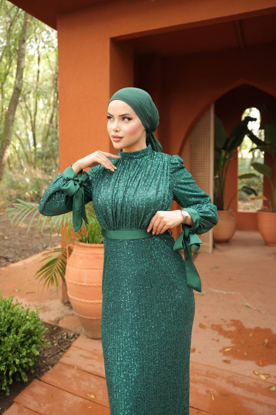 Magnifiquement ornée de paillettes partout, cette robe de soirée modeste et étincelante a une encolure ronde, un corsage ajusté et des manches longues ornées
